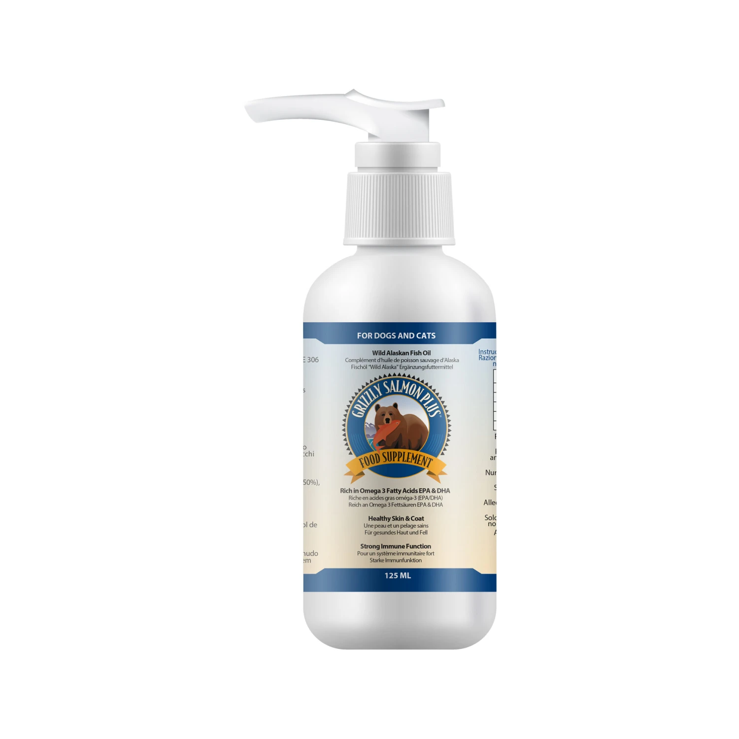 De verhouding tussen de omega 3- en omega 6-vetzuren in Grizzly Wilde Visolie is meer dan 9:1, in tegenstelling tot zalmolie van gekweekte zalm, waar de verhouding lager is dan 3:1. Grizzly Wilde Visolie is daarom een veel krachtigere bron voor het aanpassen van de algemene verhouding omega 3- en 6-vetzuren in de voeding van uw huisdier, die meestal veel te veel omega 6-vetzuur bevat (bijvoorbeeld uit plantaardige olie en kippenvet).