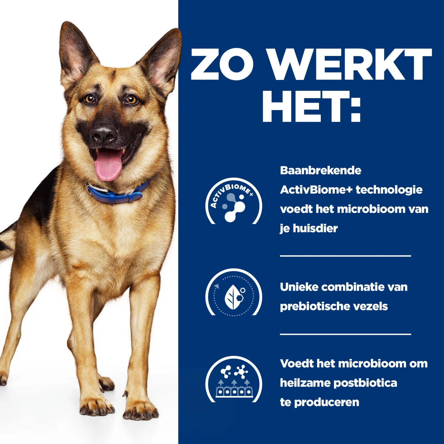 Het kan wel eens voorkomen dat een hond te maken krijgt met negatieve invloeden op de spijsvertering. Wil jij als baasje op deze momenten uw trouwe viervoeter een handje helpen? Dat kan met de Hill’s Prescription Diet – Gastrointestinal Biome. Dit dieetvoer voor volwassen honden draagt bij aan een gezonde darmflora en ondersteunt de spijsvertering. De speciale technologie in dit dieetvoer voor honden, genaamd ActivBiome+ zal helpen de regelmatige stoelgang te bevorderen en bij te dragen aan de vermindering van toekomstige spijsverteringsklachten. De unieke mix van actieve vezels voedt de darmflora en zal de gezonde spijsvertering helpen ondersteunen. Het is een volledige dieetvoeding die alle voedingsstoffen bevat die volwassen honden nodig hebben. Raadpleeg altijd de dierenarts voor meer informatie hoe Hill’s Prescription Diet voedingen kunnen bijdragen aan een gelukkig en gezond hondenleven.
