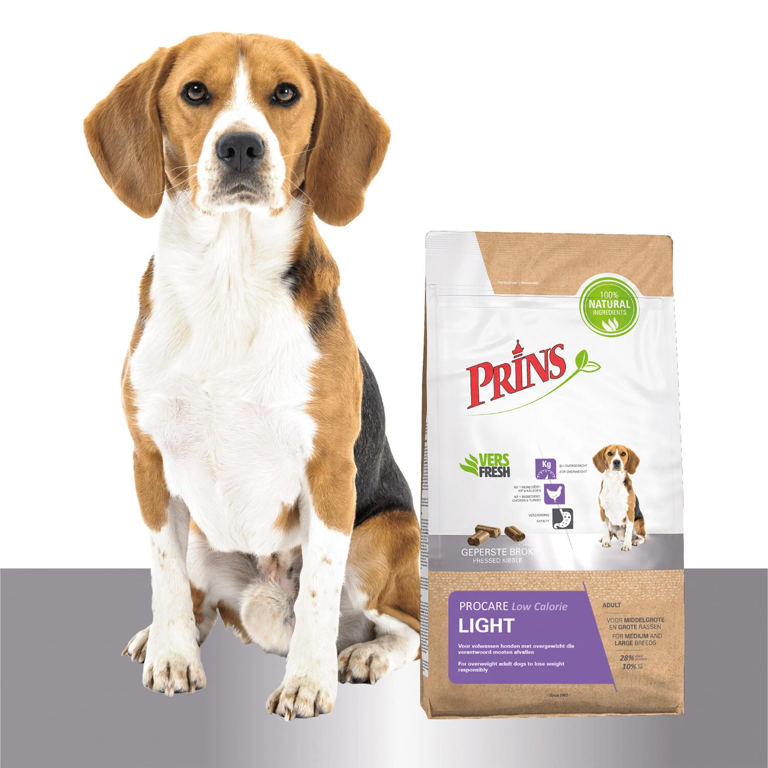 Is uw hond (iets) te dik? Dan kan de ProCare Light Low Calorie van Prins een geschikte voeding zijn voor volwassen honden met overgewicht. De geperste brokken bevatten een laag vetgehalte en extra voedingsvezels, die bijdragen aan het verantwoord afvallen. De stof L-carnitine draagt bij aan het stimuleren van de vetstofwisseling. De extra voedingsvezels in het voer ondersteunen een verzadigd gevoel. De balans aan voedingselementen dragen bij aan een optimale conditie tijdens het afvallen. De eiwitten van kip en kalkoen ondersteunen de groei, instandhouding en de conditie van de spieren.