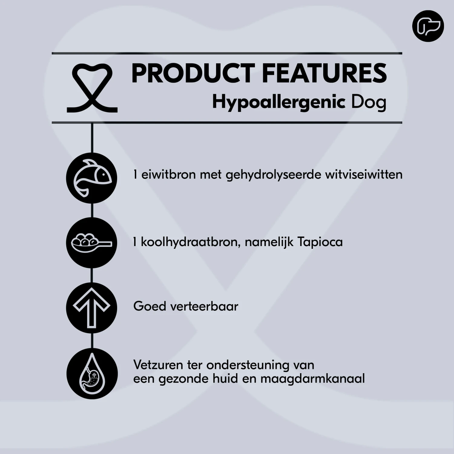 Voedselallergie betekent dat uw hond overgevoelig reageert op bepaalde ingrediënten in de voeding. Het is dan belangrijk deze ingrediënten te vermijden. Vetality Hypoallergenic maakt gebruik van sterk verkleinde (gehydrolyseerde) eiwitten van witvis en tapioca. Twee ingrediënten die zelden een overgevoeligheidsreactie uitlokken. Licht verteerbare ingrediënten zorgen daarbij voor een optimale spijsvertering en goede darmflora. Omega-3 vetzuren dragen bij aan een gezonde huid door deze te voeden en te beschermen.